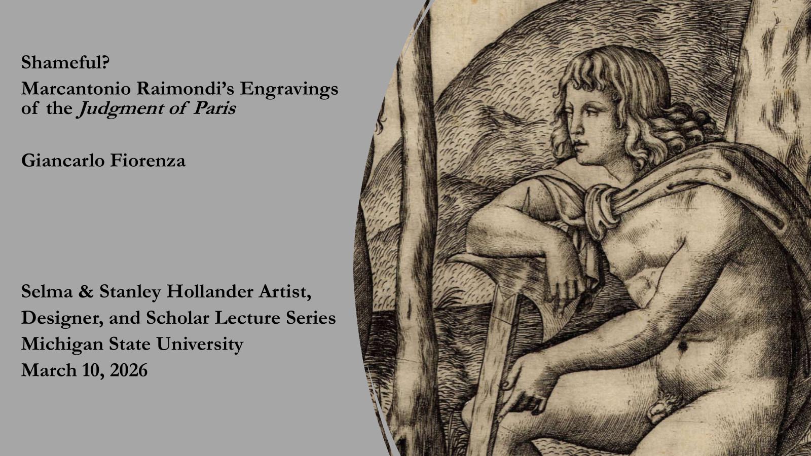 Cal Poly's own Art Historian, Giancarlo Fiorenza, has been invited to present a lecture on his current research at Michigan State University on March 10, 2026. The title of his lecture is "Shameful? Marcantonio Raimondi’s Engravings of the Judgment of Paris."