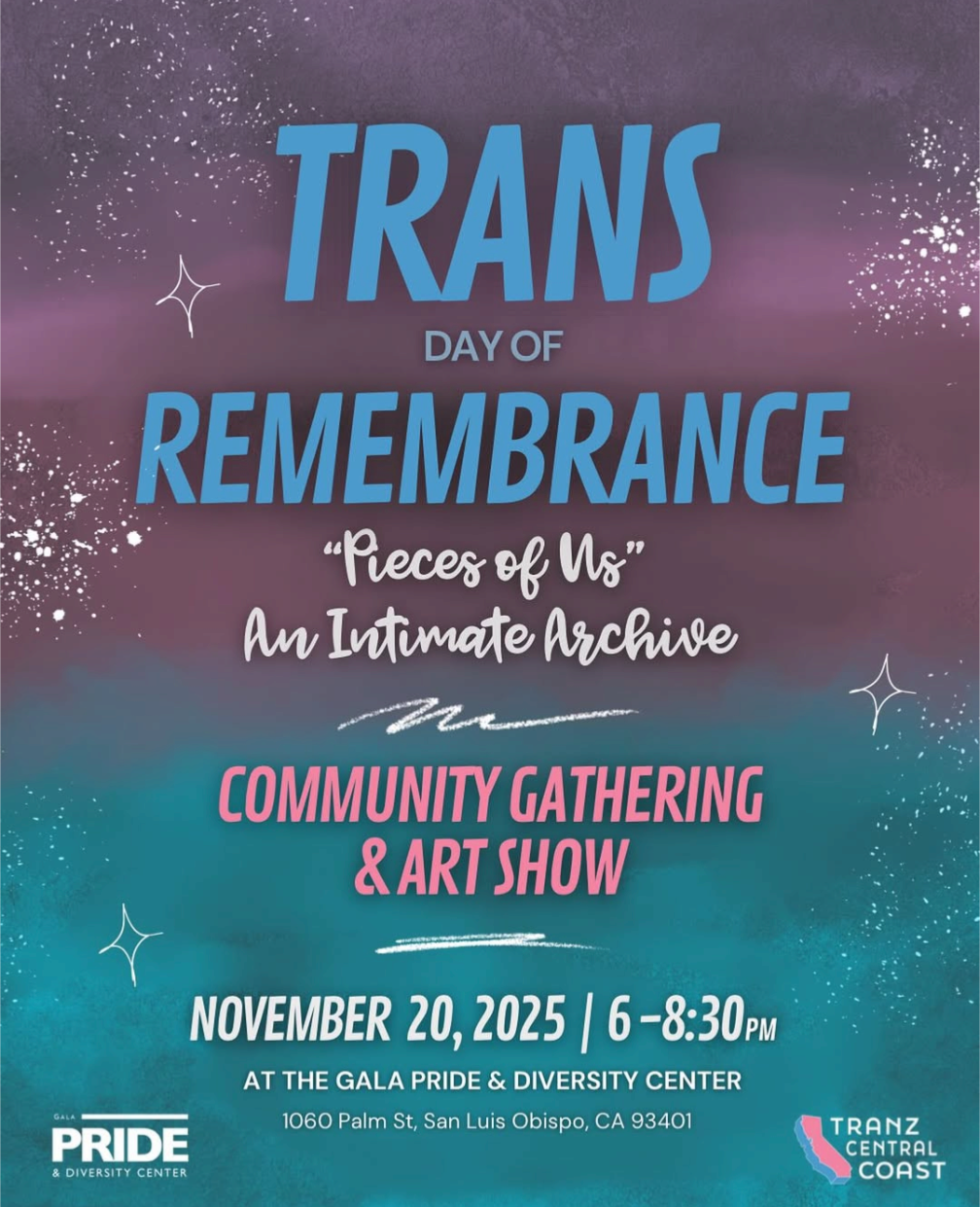 Please join us for our Transgender Day of Remembrance community gathering at the Pride and Diversity Center on Thursday, November 20th from 6-8:30pm. Tranz Central Coast is hosting an interactive art exhibit, Pieces of Us: An Intimate Archive celebrates and memorializes transgender and gender diverse individuals in our community through cherished objects and identity-charged artwork. Visitors are encouraged to bring objects that reflect on the trans* experience of their friends, chosen family, or in their own life. Objects will be arranged and on view at GALA through December.
