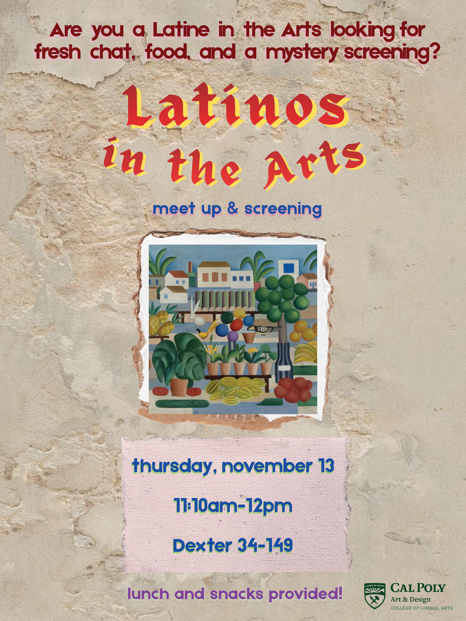 Join us for a relaxed gathering where we’ll share interests in Latine/x visual culture, music, and the arts. No pressure, no prep—just a welcoming space to chat, snack, and imagine ways to foster and celebrate our cultures. Food provided. All are welcome.