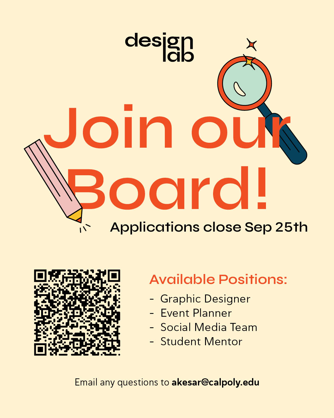 Design Lab is our professional graphic design club on campus. It is a great way to get involved, meet other designers and learn from others outside of your cohort. Being a part of our board gives you the amazing opportunity to be even more involved! As a team we put on events like speakers, studio tours and so much more! Check out the link to our application.